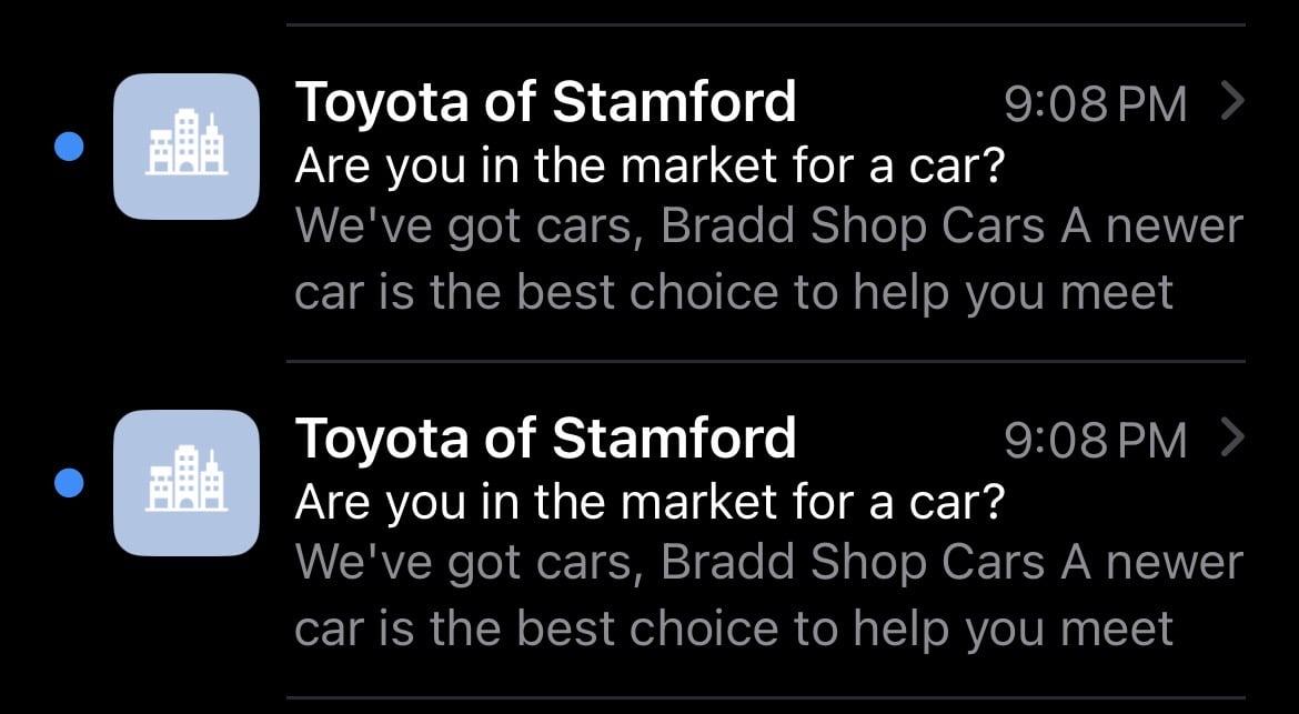 Yes, Toyota of Stamford, everyone here is in the market for a car at all times. Please tell us more.