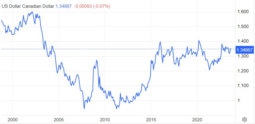 I remember CAD being around 63-64 US cents in the late 90s. I also recall it being over par early in the teens.