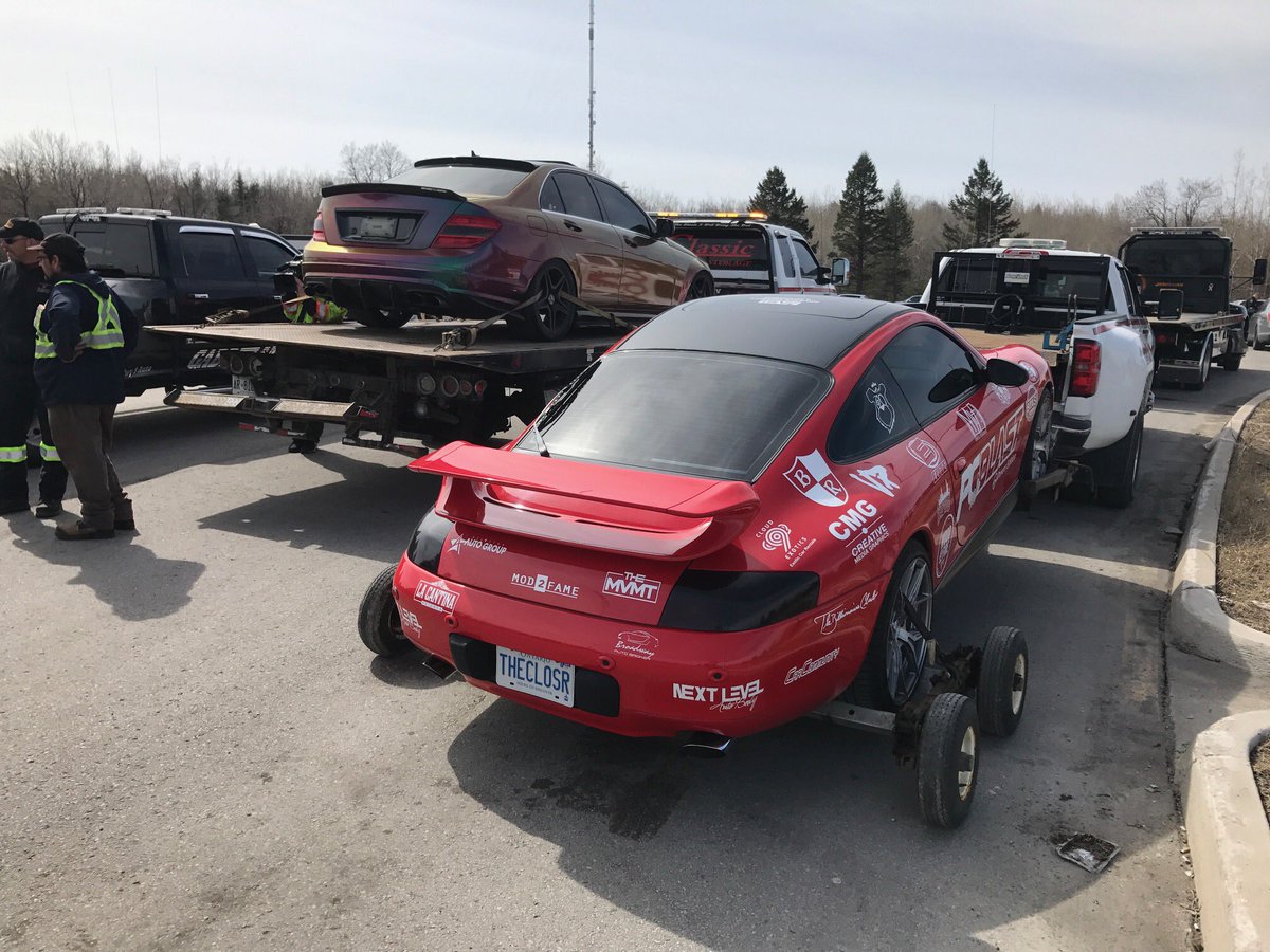 Twelve luxury cars have been impounded and their drivers charged with stunt driving after police say they put on a dangerous display on Ontario’s Highway 400 on Sunday. )