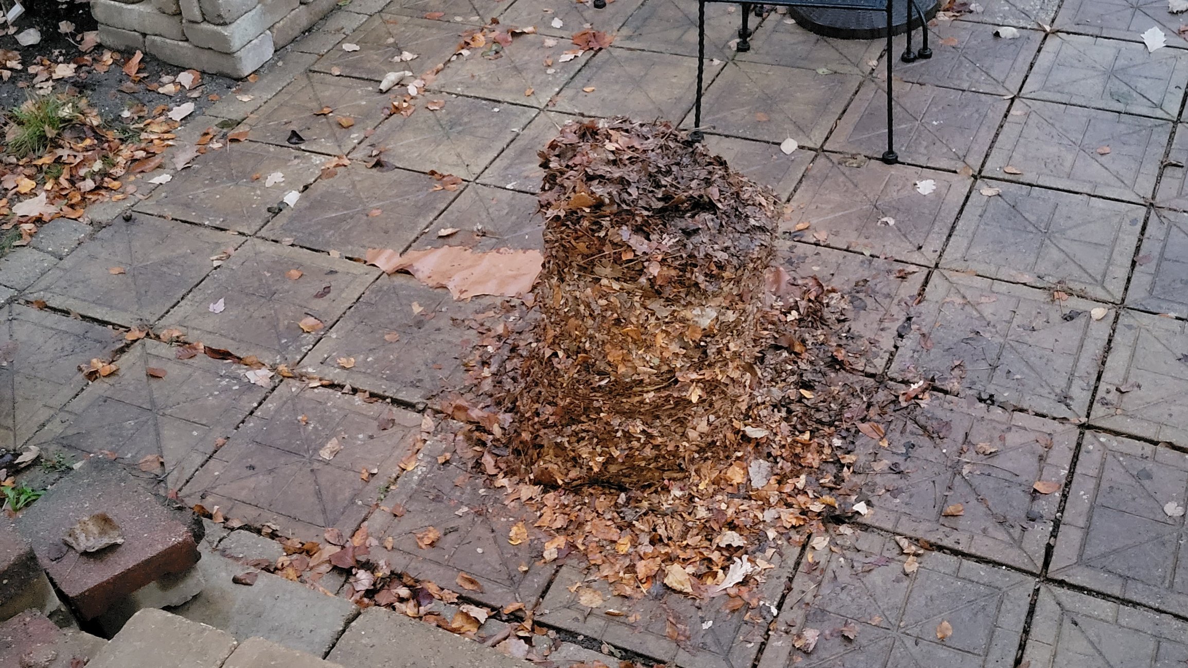 Did I ever mention that I hate squirrels? I gathered up some leaves and got them onto a yard waste bag to move to the curb for pickup. Well here is what is now a pile of leaves. The squirrels came and tore the bag to pieces and ran off with the pieces leaving a near neat pile of leaves. In the picture you can see a piece of the bag behind the leaves.