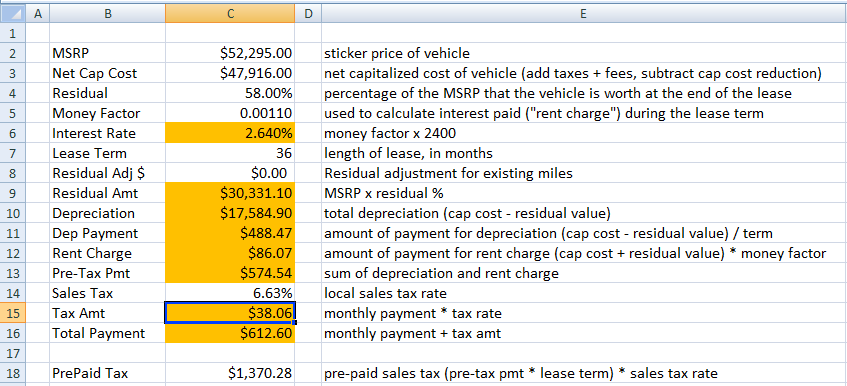 I have a spreadsheet I have been using, and making these calculations is far more complex than I would have thought. I still can't quite zero in on what I'm receiving in quotes, but part of the problem is calculating Net Cap Cost means adding in tax, but you need Net Cap Cost to calculate the tax, so it becomes an unresolved loop in Excel. So I am leaving tax out of Net Cap Cost (meaning it is no longer net), and my calculation comes out about $2 less than the dealer. I guess that's close enough.