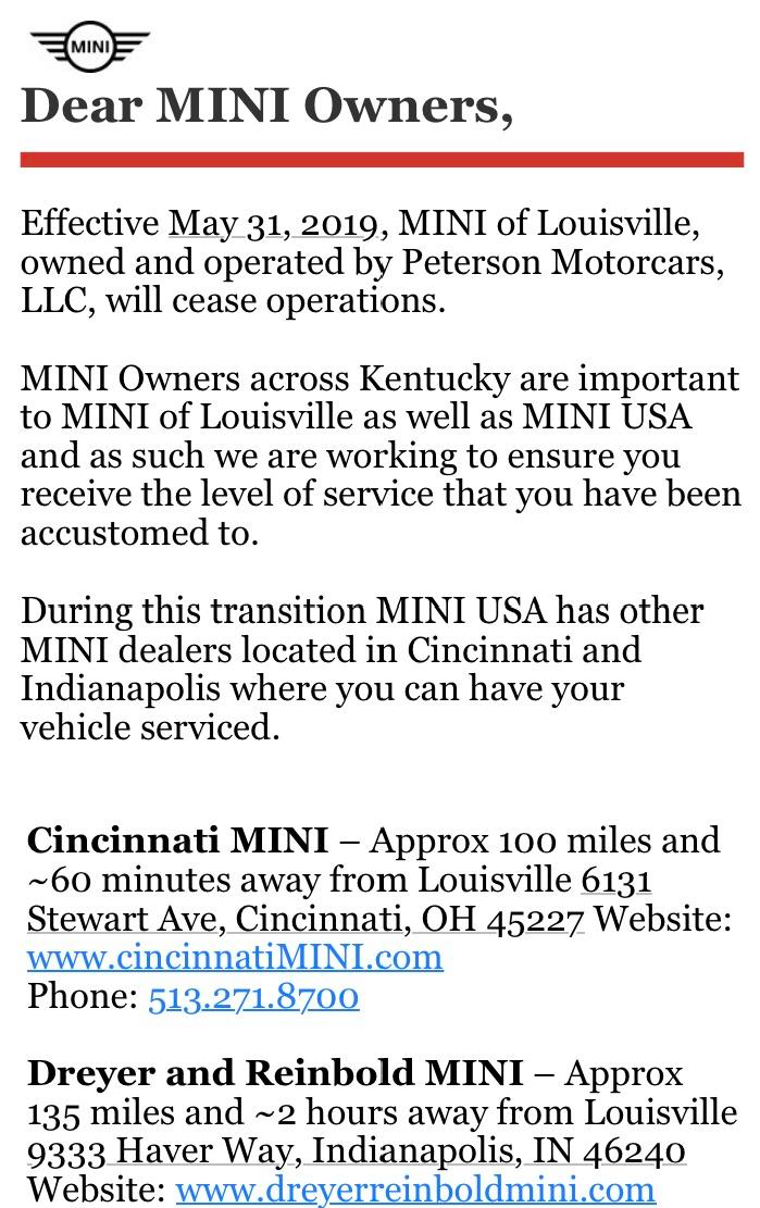 I'm hearing BMW NA wants to move/merge their Mini stores into existing BMW dealerships wherever possible. I hate that the Louisville dealer is closing. When I took my Mini there for an oil change they went above and beyond.
