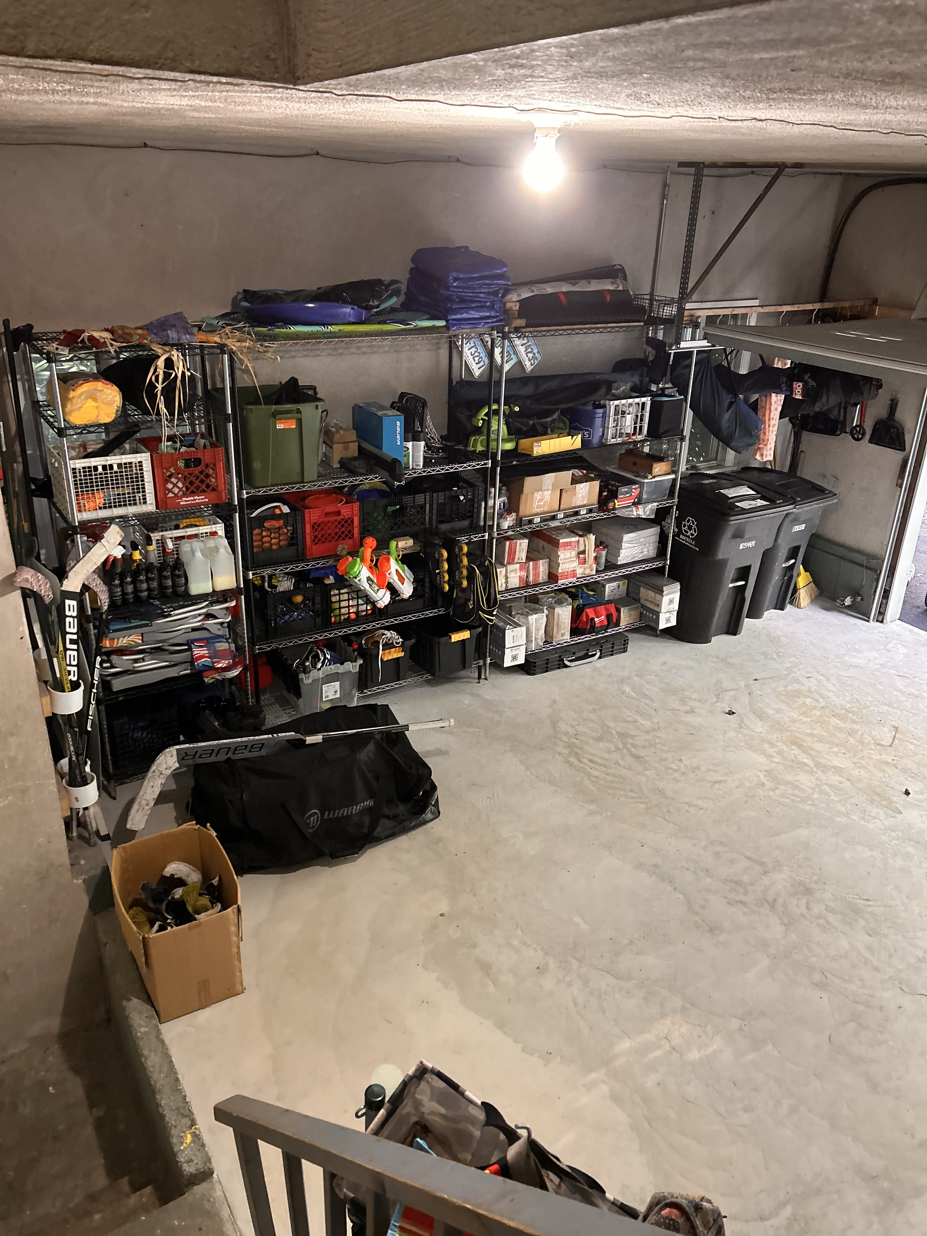 If I had a garage with that kind of ceiling height I’d get a lift and put all that stuff on it and send it up out of the way.