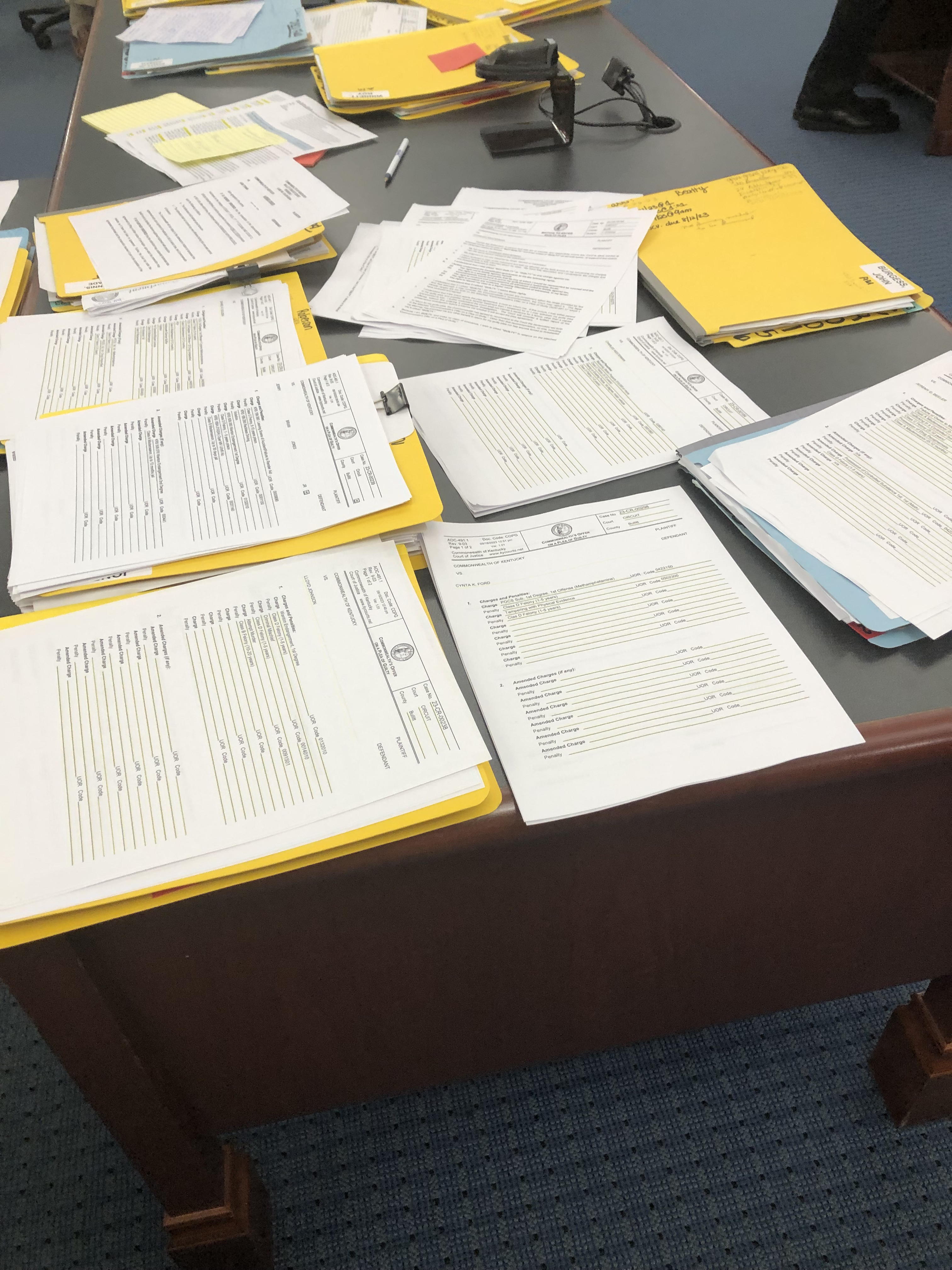 Here’s my counsel table midway through the afternoon motion day docket. Every stack of papers is a separate plea offer that I presented to the judge.