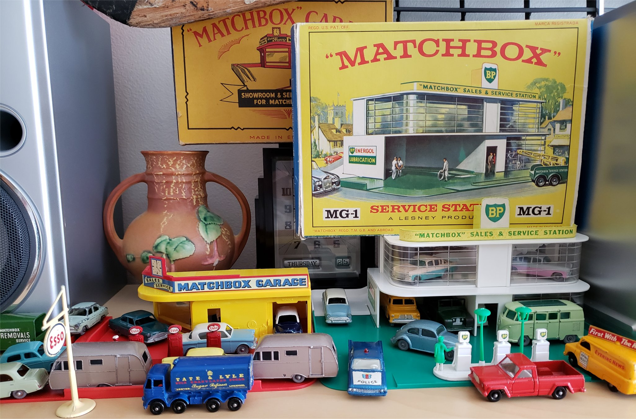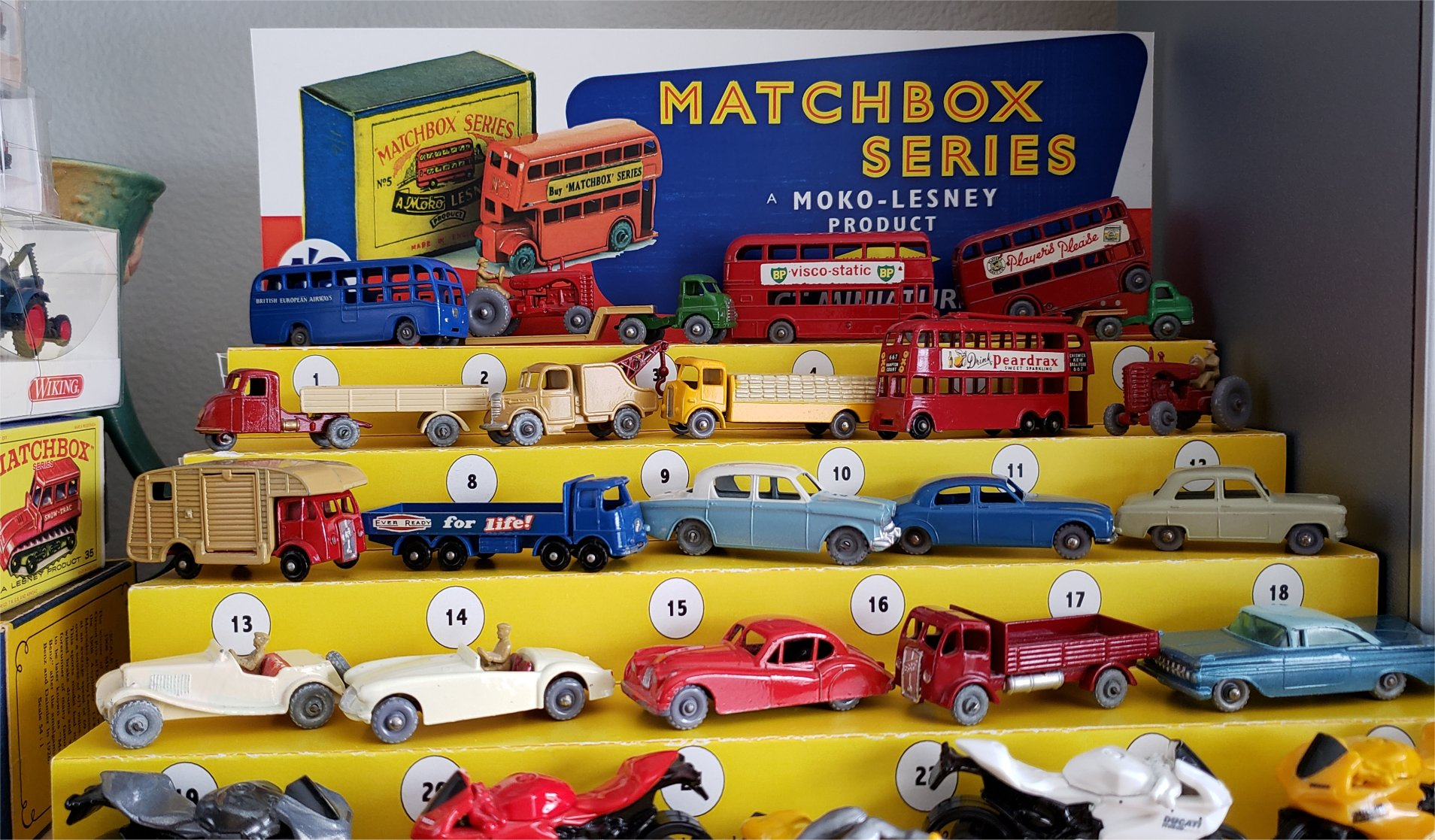 I think in the background I recognise pink and grey Vauxhall Cresta / Velox and a yellow Victor - both Matchbox - I have my childhood Matchbox cars in our loft although access is difficult presently.