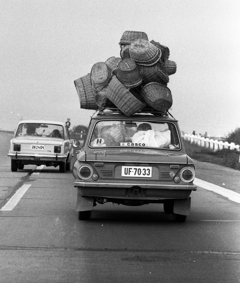 The basket car appears to be a ZAZ Zaporozets. I assume a Hungarian registration by the H.