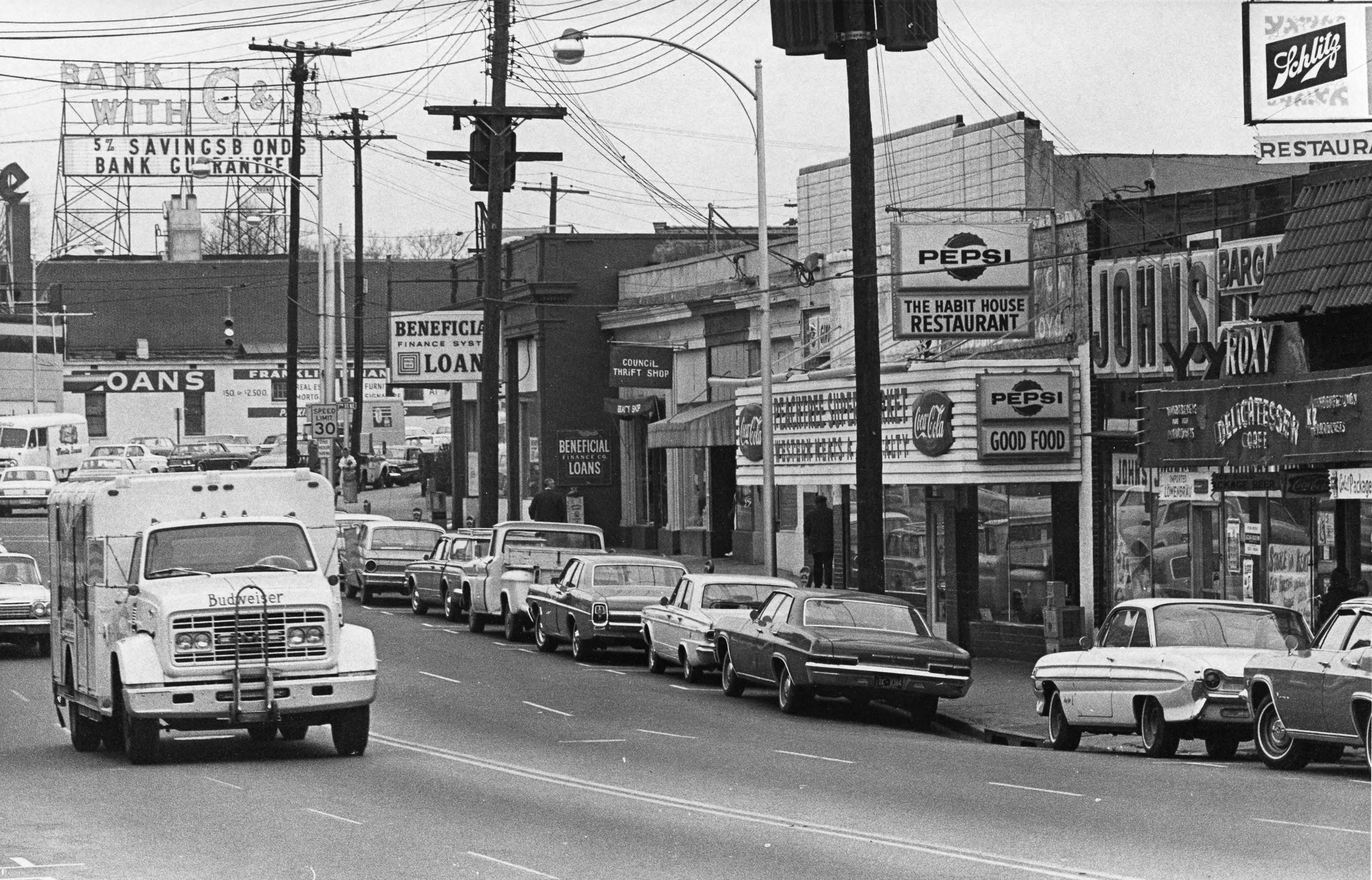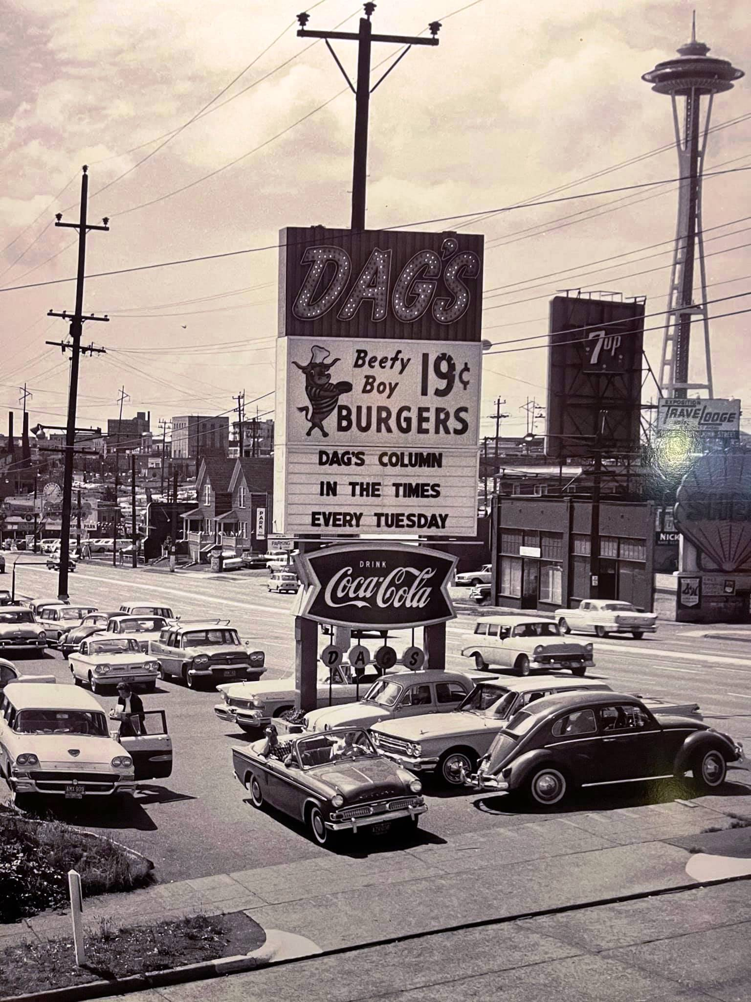 I've seen this pic before, it is likely from 1962, with all of the World's Fair hoopla. The location is 700-900 or so Aurora Avenue, looking completely different now, filled in with mid-rise apartment buildings.