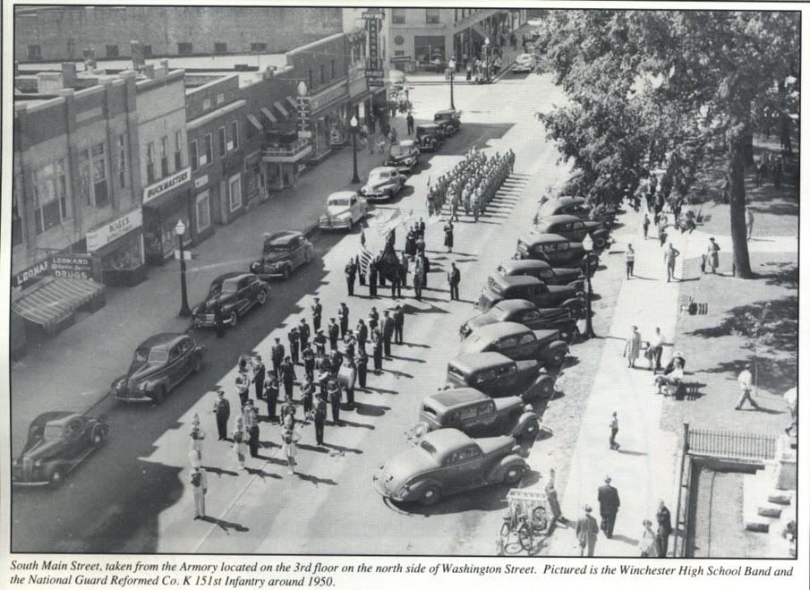 A lot of cars are visible from this overhead picture. Supposedly about 1950 but many of the cars have headlight on separate pods instead of built-in mounts. From Winchester, Indiana via a facebook hometown type link of county-wide pictures.