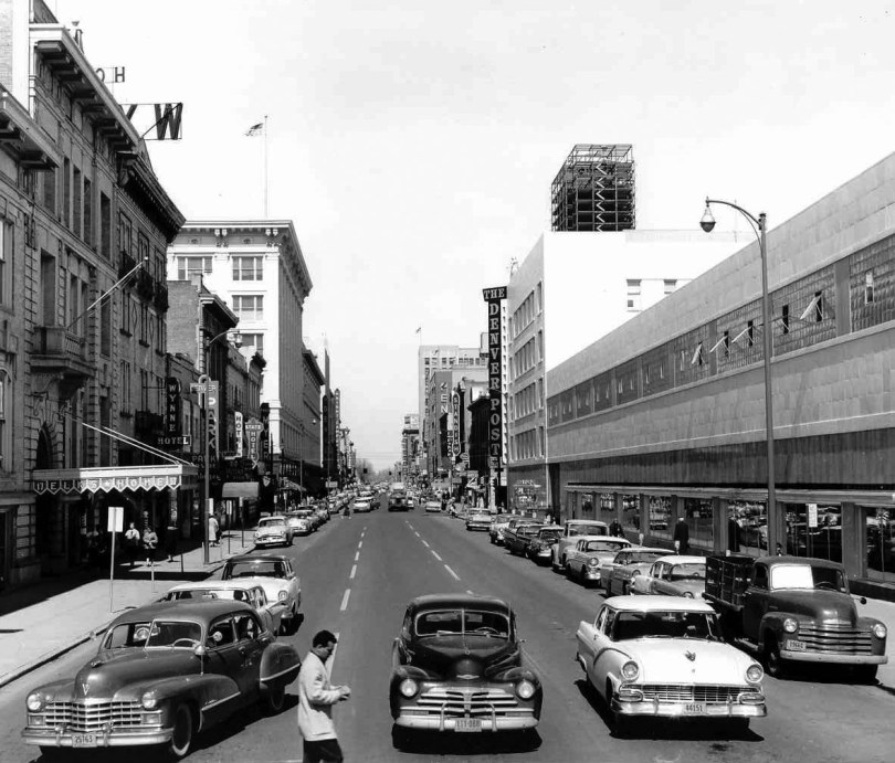 Interesting shot. The Caddy on the right looks like a '47/'48 and directly behind it we can see a Ford, perhaps a '57 so there's a big spread of years represented. The Chevy in the middle looks about the same vintage as the Cadillac. Most of the other cars visible are nearly decade newer than the 2 oldies in the front row.