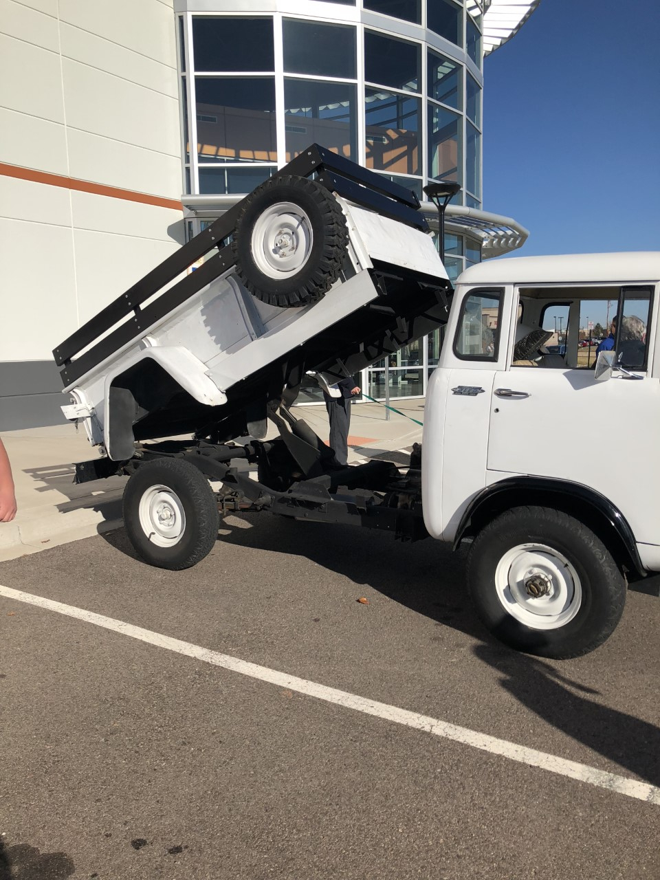 Watched the owner back it in and raise the bed. Says it is used as a work truck - and, that it wears a plow in the winter.