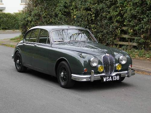 Sure looks like a Jag MK.II but it's a 1968 Jaguar 340, essentially a de-contented Mk. II with vinyl upholstery, no front fogs (they were optional). They wire wheels on this car were not original and the car had to be converted to wear them (new splines).
