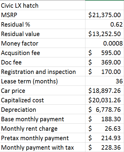 Do you have lease numbers for April, Civic Hatch Sport Touring, 36/12K? PA.