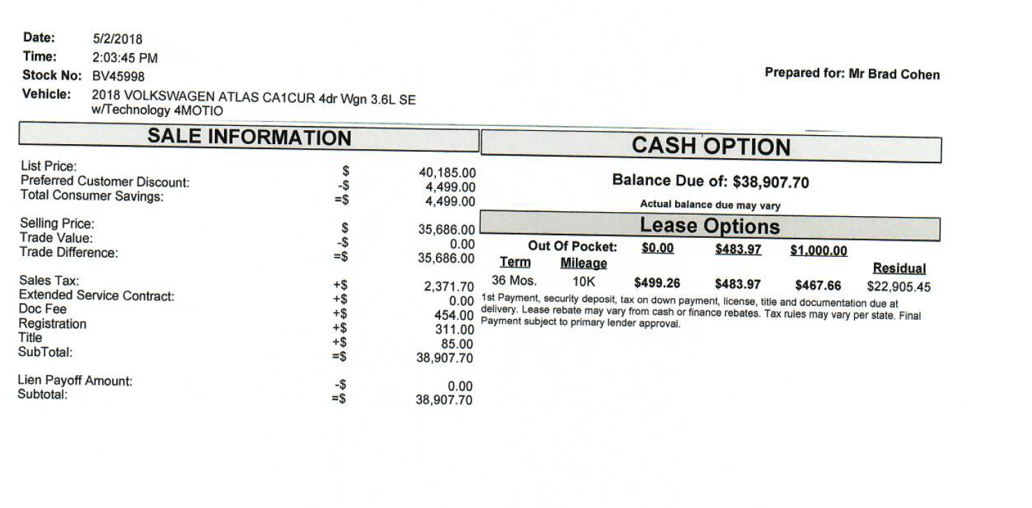 Lease Cash, Residual, and MF for Atlas SE 4motion with Technology Package
