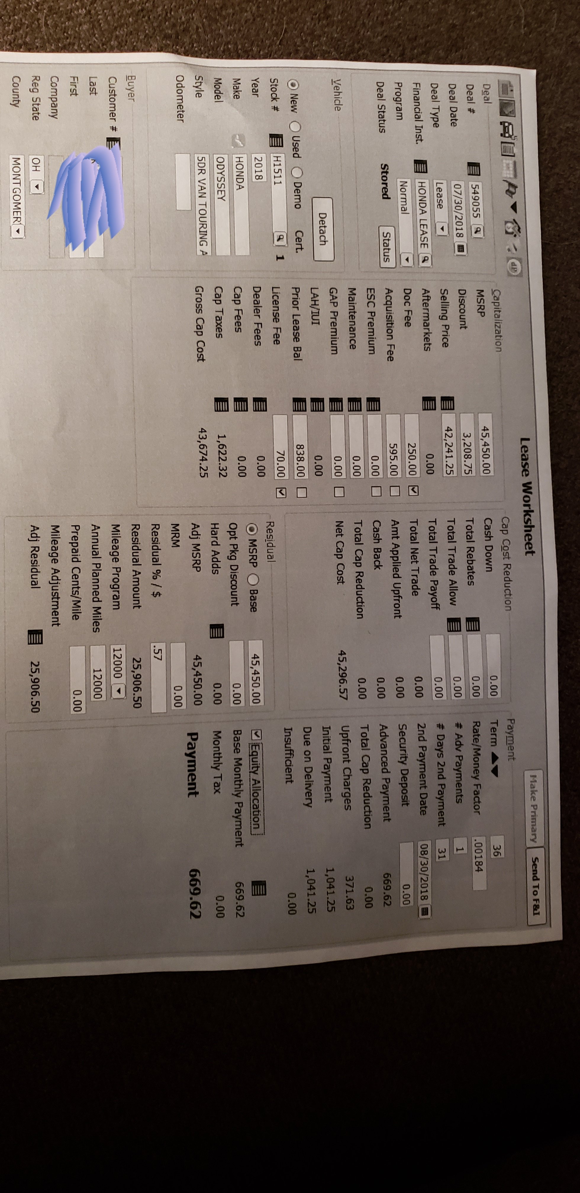 MF, residual, and incentives for 2018 Honda Odyssey LX 36/15k in 91423