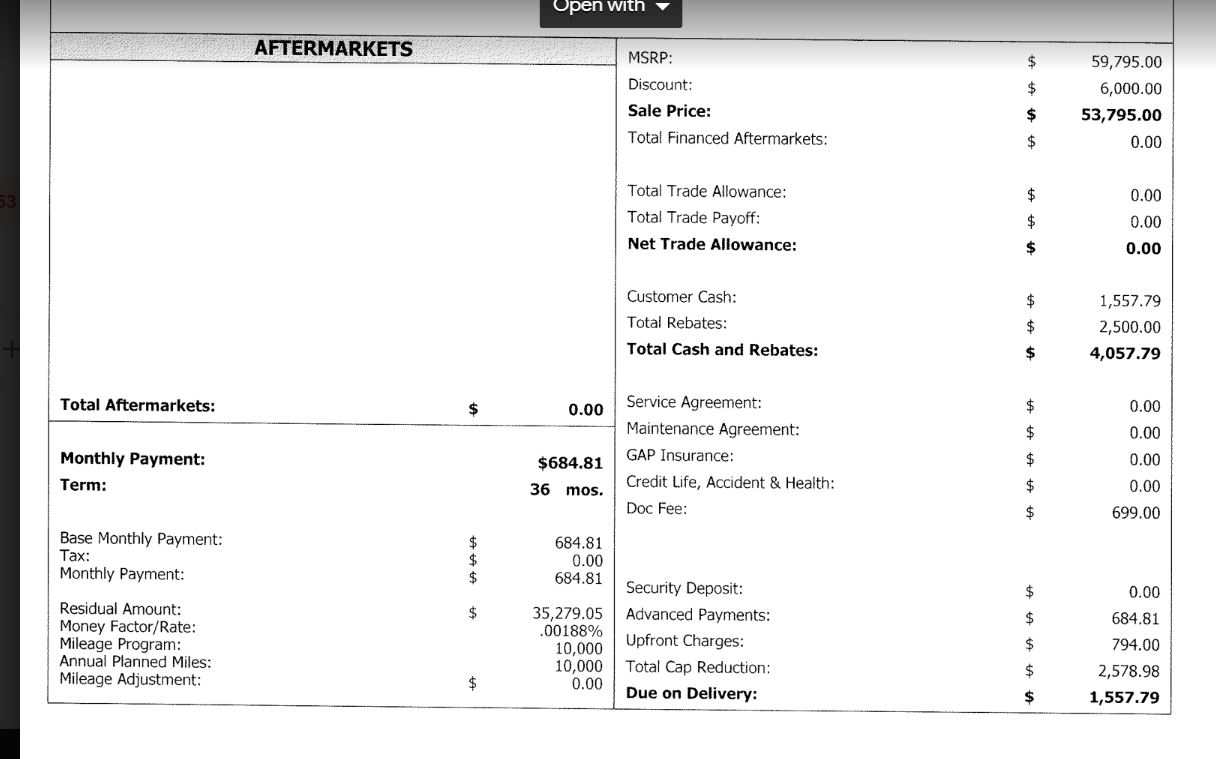 Right now the selling price is $44k. For 36mo\10k the payment they are offering is $625 tax included with $1500 drive off. Seems high for this selling price?