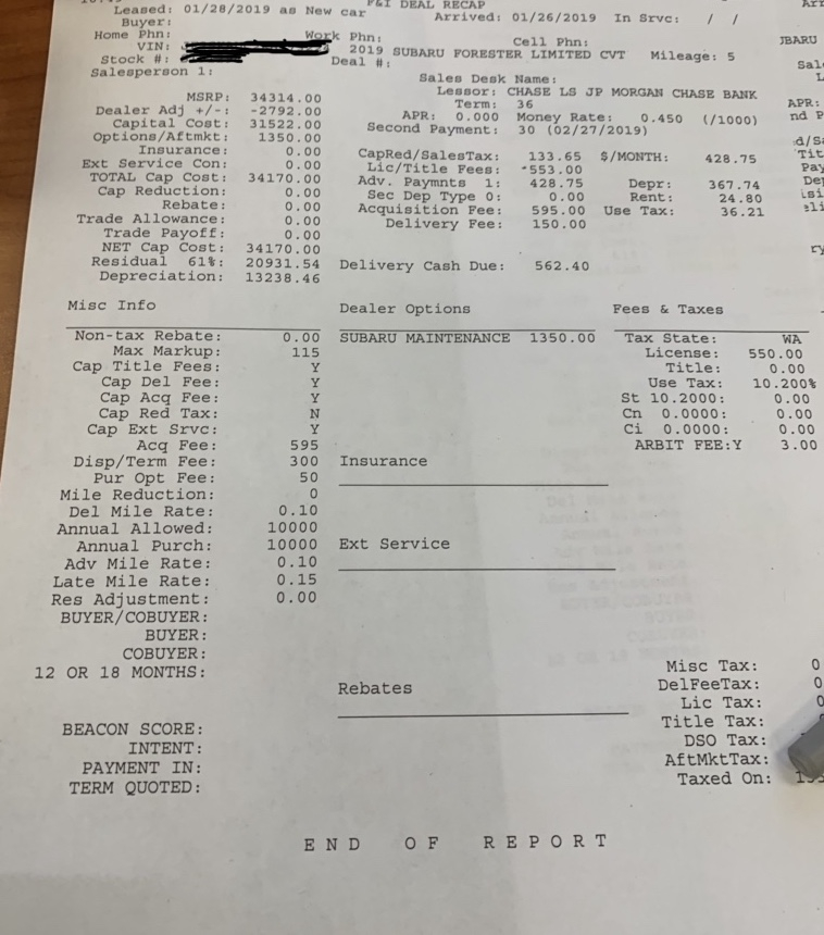 Please provide the MF and RV for a 2019 Forester Prem. AWD 36/10 w/ All Weather in 14425. Does Subaru have a acquisition fee at the beginning or end of lease and if so amount?