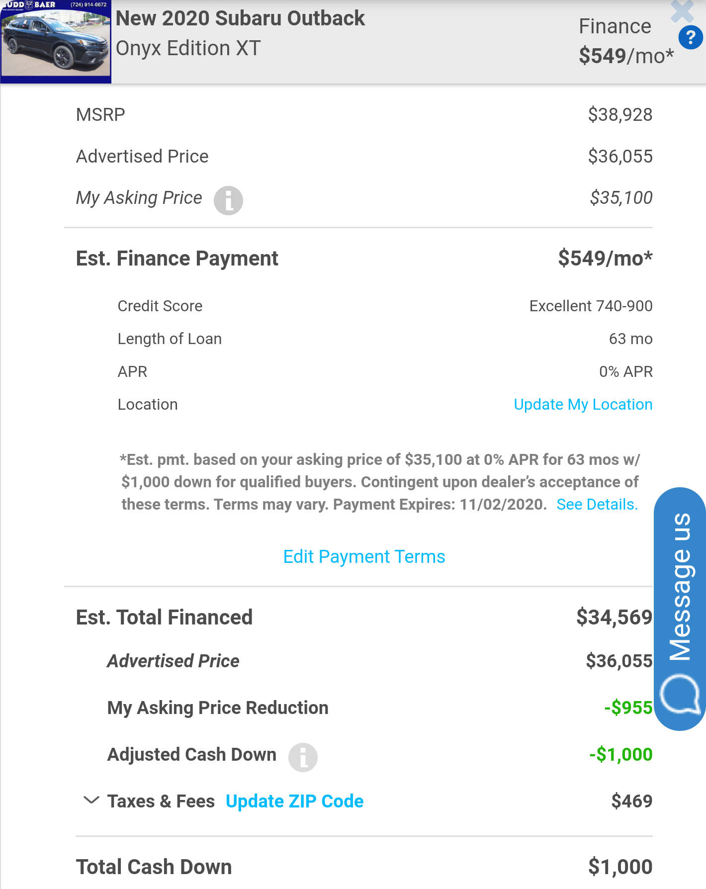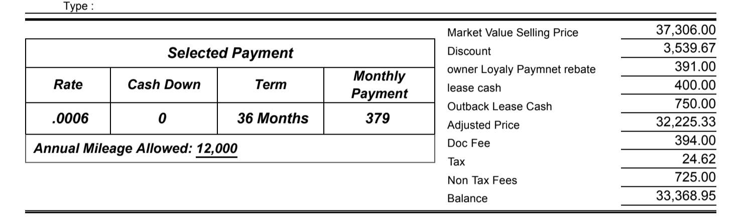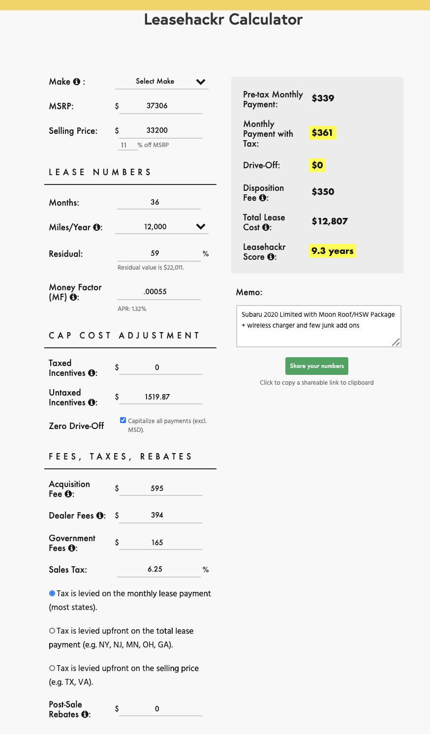 leasehackr.com/calculator?make=none&miles=12000&msd=0&msrp=37306&sales_price=33200&months=36&mf=.00055&dp=0&dealer_fee=394&acq_fee=595&taxed_inc=0&untaxed_inc=1519.87&rebate=0&resP=59®_fee=165&sales_tax=6.25&demo_mileage=0&memo=Subaru%202020%20Limited%20with%20Moon%20Roof%2FHSW%20Package%20%2B%20wireless%20charger%20and%20few%20junk%20add%20ons&zero_driveoff=true&monthlyTax_radio=true&dealerFee_check=false&govFee_check=false">leasehackr.com/calculator?make=none&miles=12000&msd=0&msrp=37306&sales_price=33200&months=36&mf=.00055&dp=0&dealer_fee=394&acq_fee=595&taxed_inc=0&untaxed_inc=1519.87&rebate=0&resP=59®_fee=165&sales_tax=6.25&demo_mileage=0&memo=Subaru%202020%20Limited%20with%20Moon%20Roof%2FHSW%20Package%20%2B%20wireless%20charger%20and%20few%20junk%20add%20ons&zero_driveoff=true&monthlyTax_radio=true&dealerFee_check=false&govFee_check=false