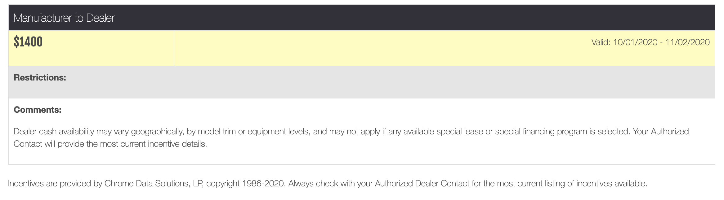 So now I'm wondering if there is an extra $1400 in dealer cash on top of the $400 you are reporting. Or, if they are in fact one and the same. I can't find this $1400 dealer cash info anywhere else on the web.