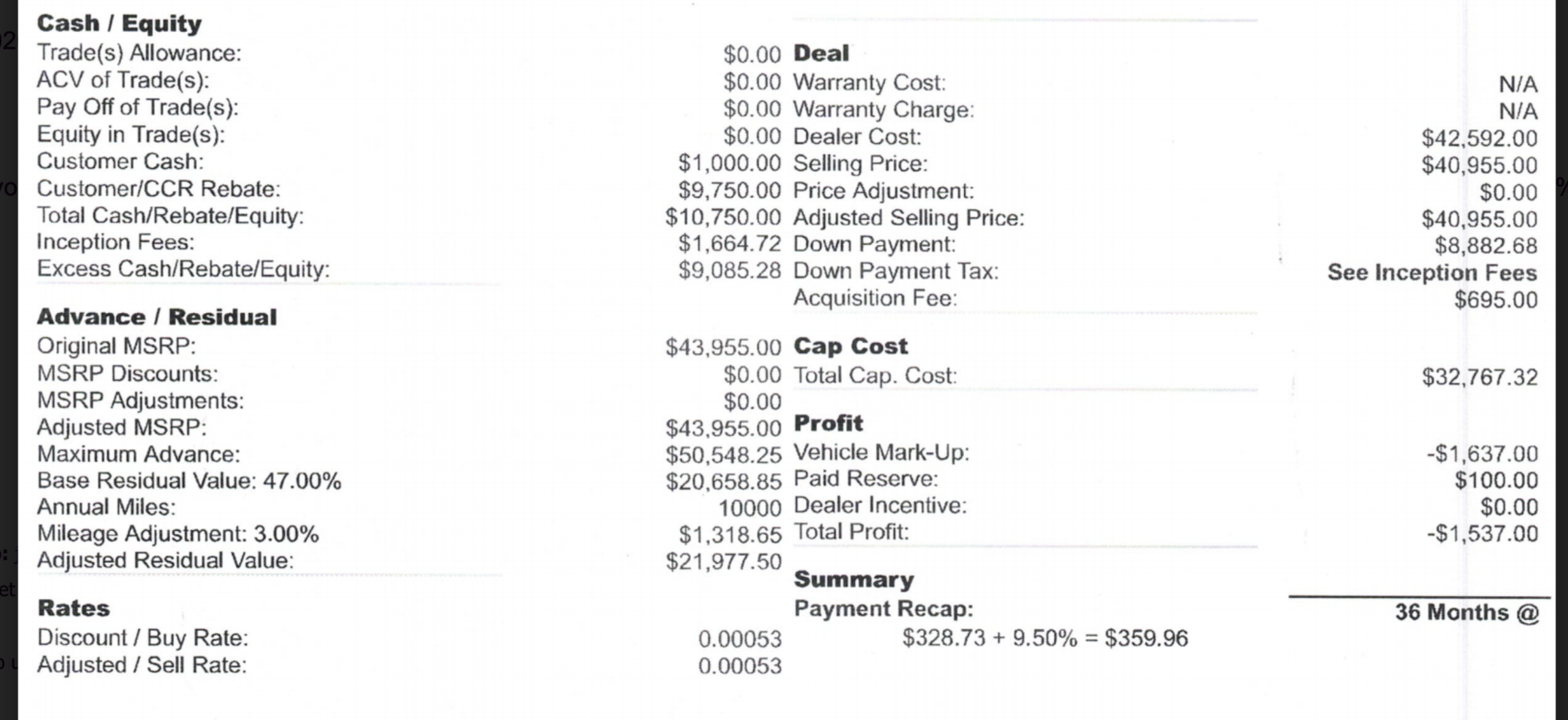 36 mos. $389.09 Rbt:$9,750.00 Cash:$0.00
