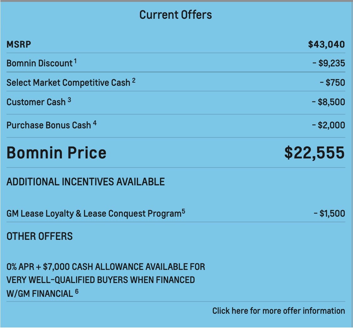 I assume the dealer discount, select market competitive cash, and lease conquest would apply, and assume the purchase bonus cash would not, but not clear on the customer cash. Fine print for customer cash just says '21-40ACA:3 Chevrolet Consumer Cash Program', so not very helpful on its face.