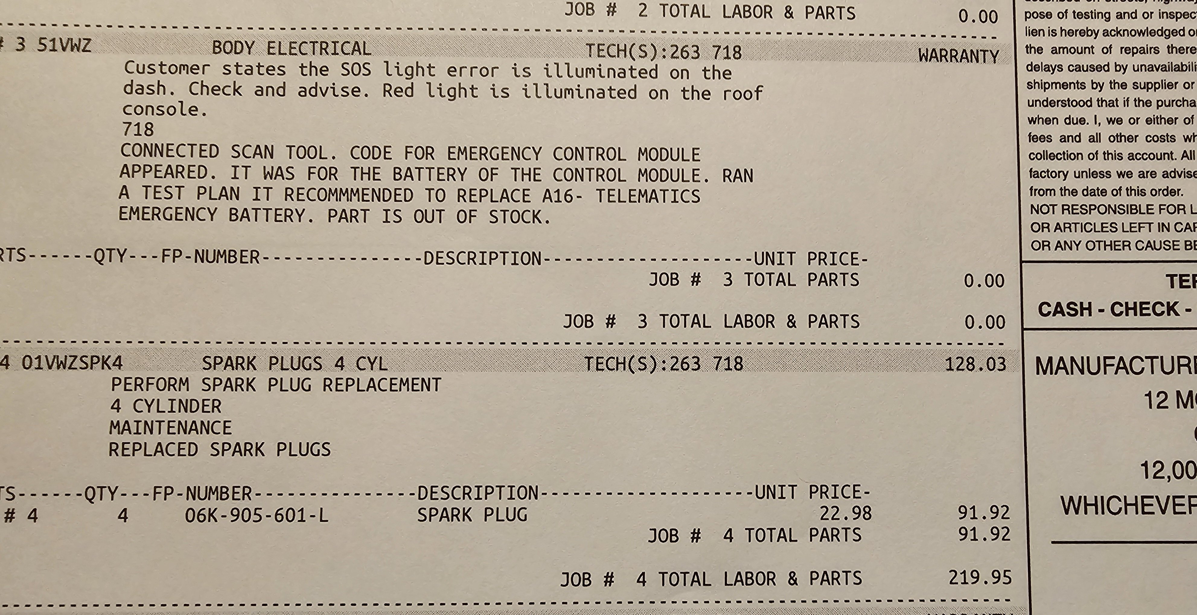I took the Arteon in for an oil change and new spark plugs as that is what VW maintenance requires. Last week the SOS warning light came on. That is the feature that dials for help in an emergency. Apparently that module has a battery which has gone bad and is on back order. Who knew!! I didn’t think the cost to replace the spark plugs was too much but not cheap. They will call me when the battery comes in and is covered by warranty. I've been fortunate this dealer has consistently provide good service.