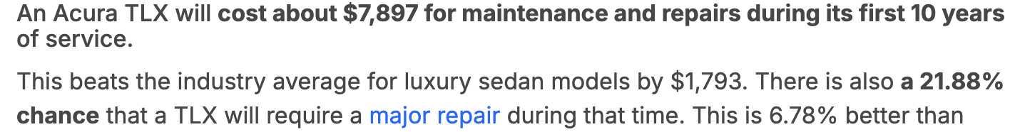 The site Car Edge says that by year 7 the average TLX owner will be spending at least a thousand a year, and that climbs steadily. More ominously is that the chance of a major repair according them goes up to 40% by the time the car is 12 years old.