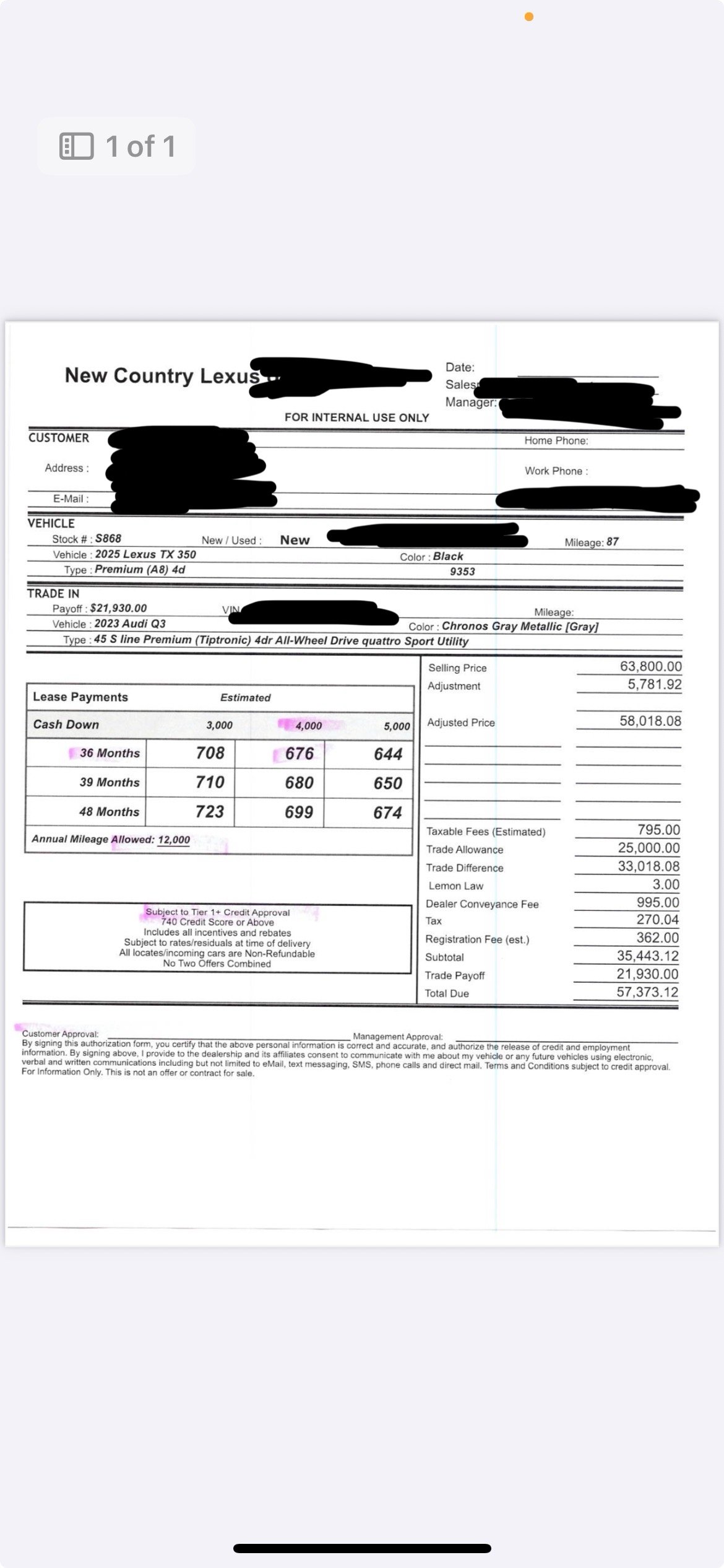 Can I get purchase price for 2025 Lexus TX luxury trim in 78738