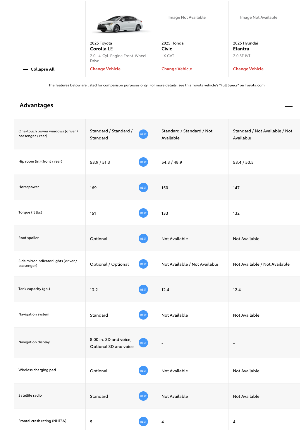 I didn’t know that about the engine change from the 1.8 to the 2.0. The slippery slope comes when you compare the Gas to the Hybrid model. It’s $1,850 more for the Hybrid. In addition to superior gas mileage you get a multi-link rear suspension, and won’t have to put brakes on the car for 120K miles. I think I mentioned this earlier, but now all Corollas have BSM standard.