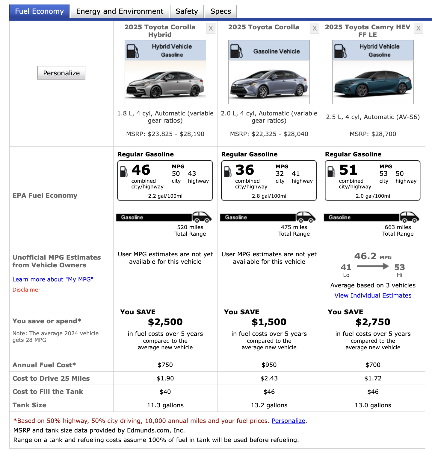 The Corolla hybrid is also a great value at $26k, although by the time you get to that price I'd spend 4k more to get the Camry LE, which is a step up in size, comfort, quality, safety, and power.