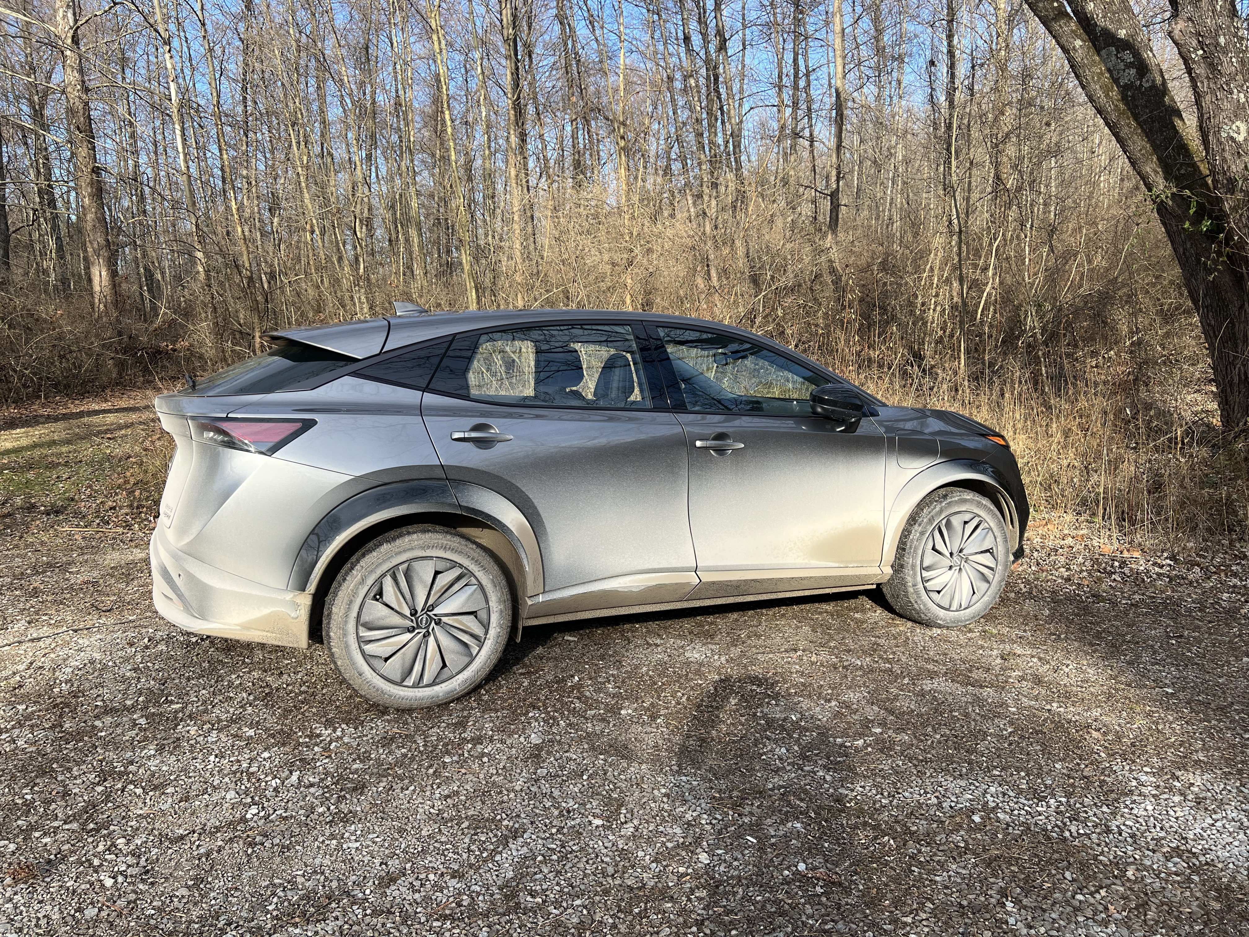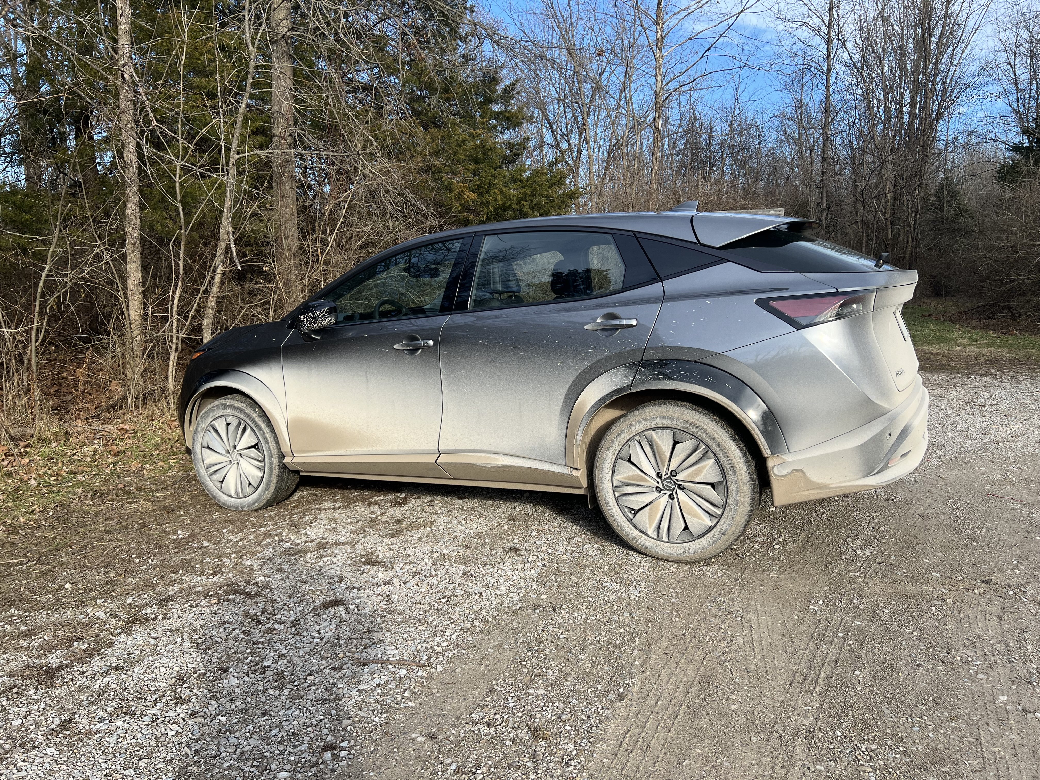 I’d consider giving the Ariya the safari treatment, but that would undoubtedly reduce its cruising range. Not sure how far I drove, but got back home with 12% battery remaining. Wet gravel at the wildlife refuge. Didn’t see much wildlife, but it was nice to hike there with almost nobody around. Same story where I hiked yesterday.