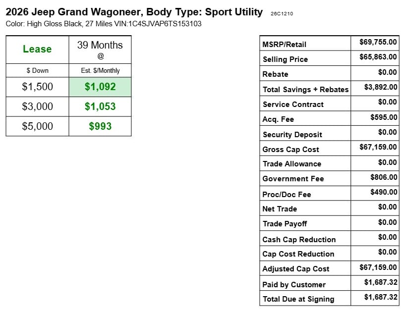 Hi Looking for lease details, MF, Residual, etc for 2026 Grand Wagoneer Base 4x4 and Altitude 4x4. Term 39/10. Zip 33021