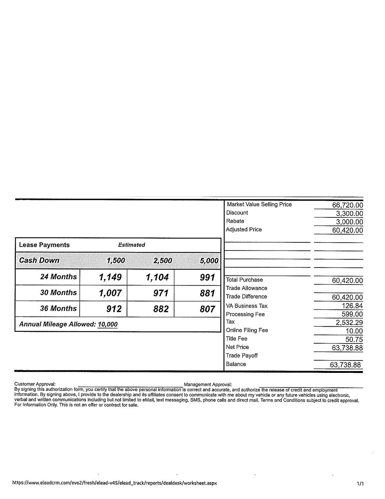Total out of pocket: 2,500 - first month's payment, taxes, title, tag, etc.