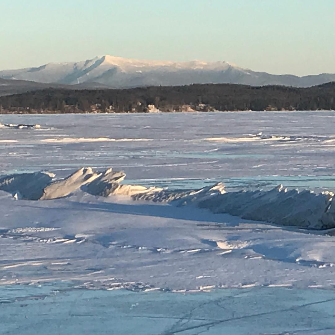 They just reported that Lake Champlain is completely iced over. But, there are pressure cracks here and there. For those who have never seen one, think plate tectonics, when the ice moves one sheet goes over and one sheet goes under. Like this: