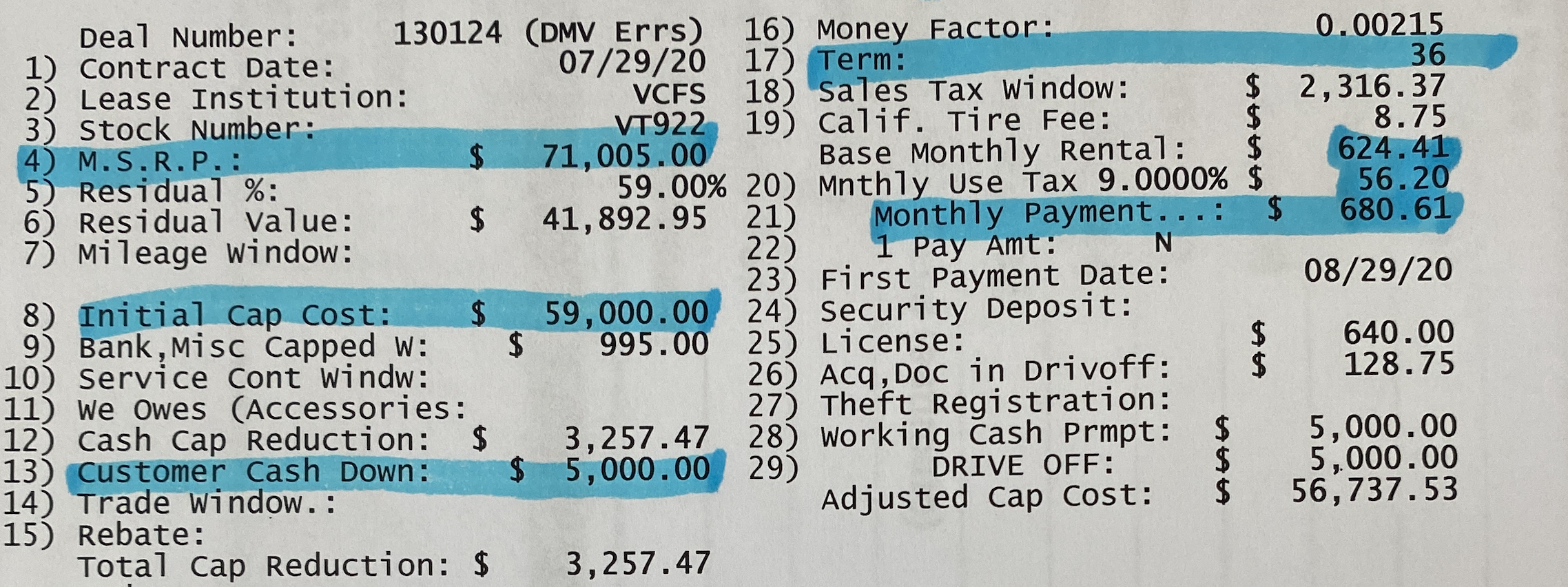 Does the net cap cost include your taxes? That might account for your discrepancy.