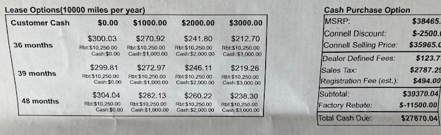 BTW, they had another Bolt LT without all the fancy options. I asked them to run the numbers on that vehicle as well. Here's what they came up with: