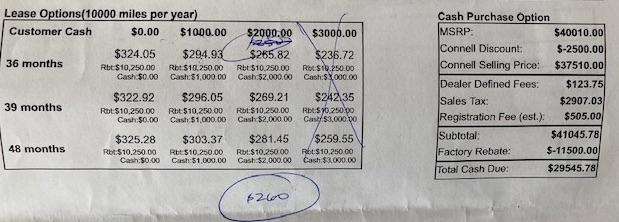 With those numbers, the manager gave us this payment matrix. We went with the $2000 down and negotiated a slightly lower price of $260/month (instead of $266). True to their word, we left paying exactly $2000 with no added costs.