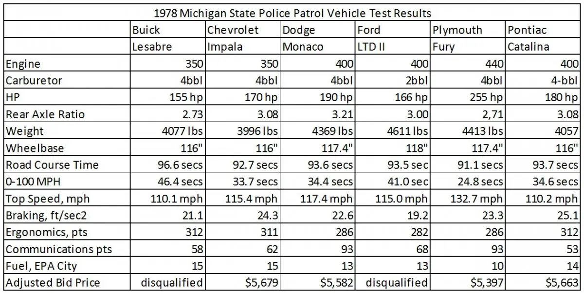 Also, even though the Pontiac 350 had 170 hp, I think the Chevy and Olds 350s performed better overall. One reason that Chevy ultimately became GM's go-to for police cars, rather than Pontiac, was that in '78, the Impala 350 actually outperformed the Catalina 400 in most respects! Although I guess Pontiac's discontinuation of the 400 after 1978 might have also played a role. Here's a chart that summarizes the 1978 Michigan State Police car test: