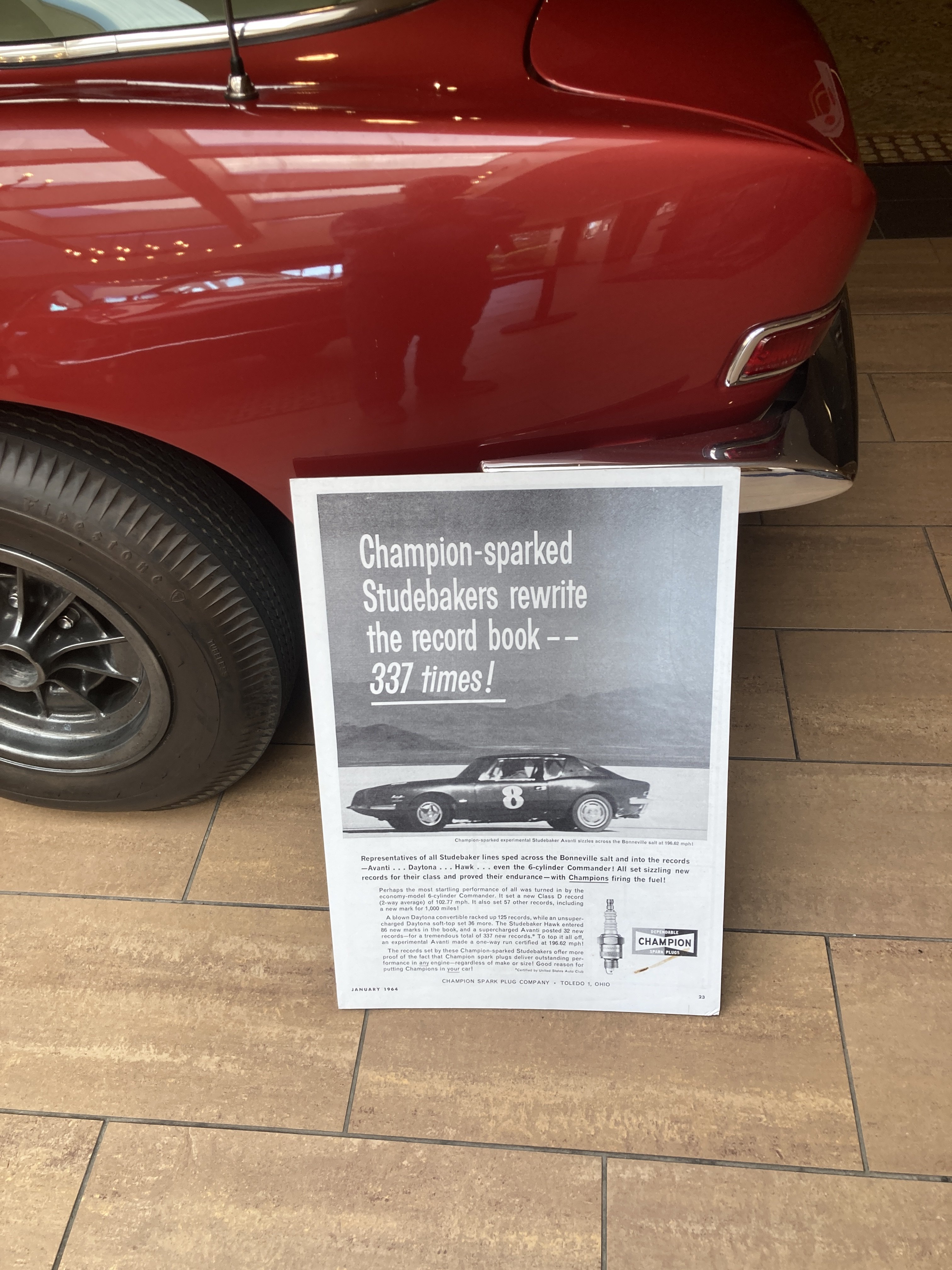 That Avanti no. 8 isn't a 'tribute' car, it's the actual car used (among others) to set land speed records at Bonneville. The one B&W photo I feel pretty sure is Stude president Sherwood Egbert driving. At the time he was the first auto CEO to personally drive his product at 170 mph. He probably still holds that record.