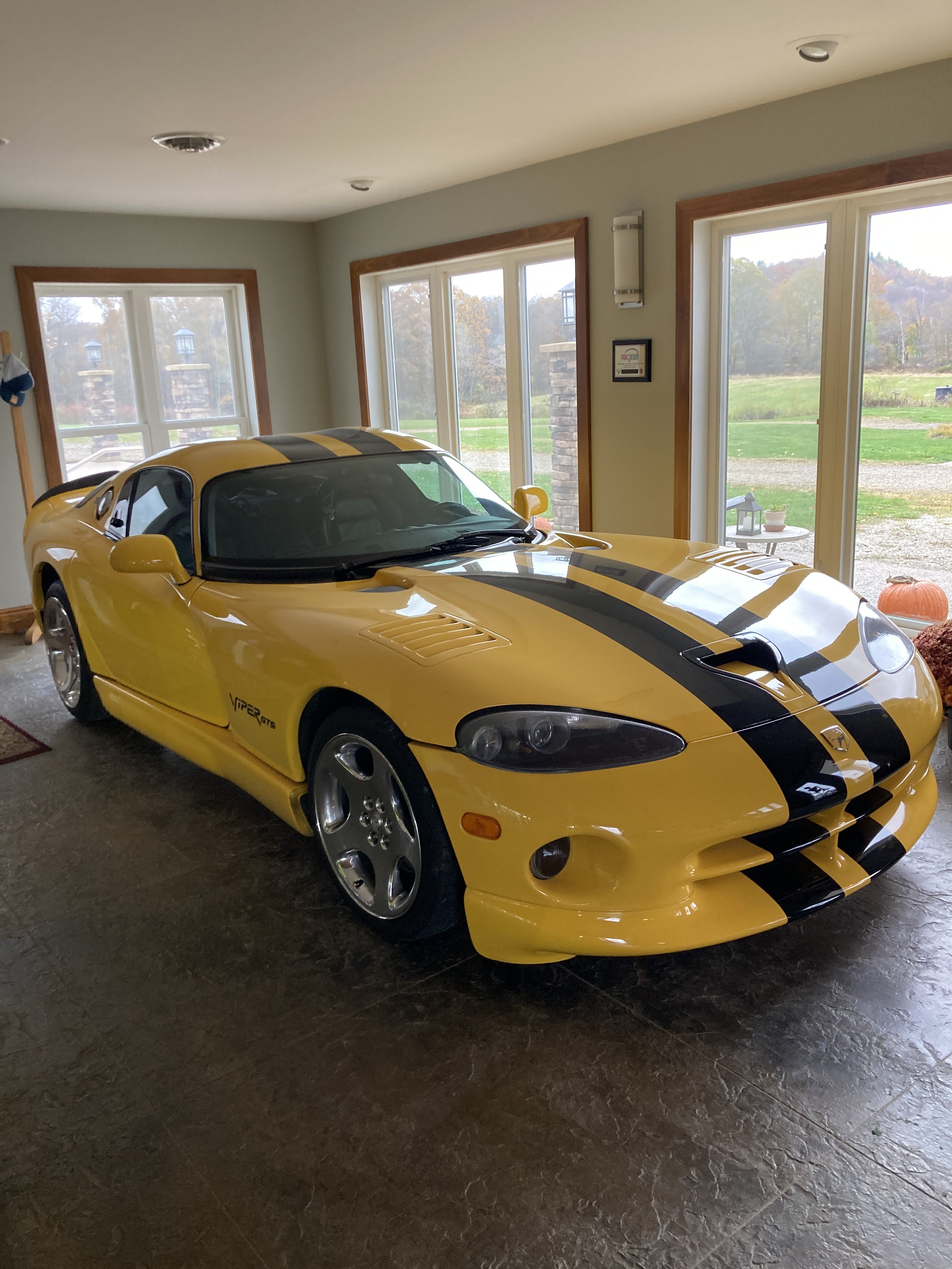 Their home is a converted barn on the property. This building shown is what they call "The Pool House", as their pool is just outside. The building is probably about 10 or 12 years old. There is a bedroom or two on the second floor, and a kitchen with counter and seats for eight or ten just to the left of the car in the pic. Besides this Viper, he keeps his '22 C8, an '82 Jeep Scrambler, and a WWII-era Army Willys Jeep (built 3-45 per the data tag on it), in that building.