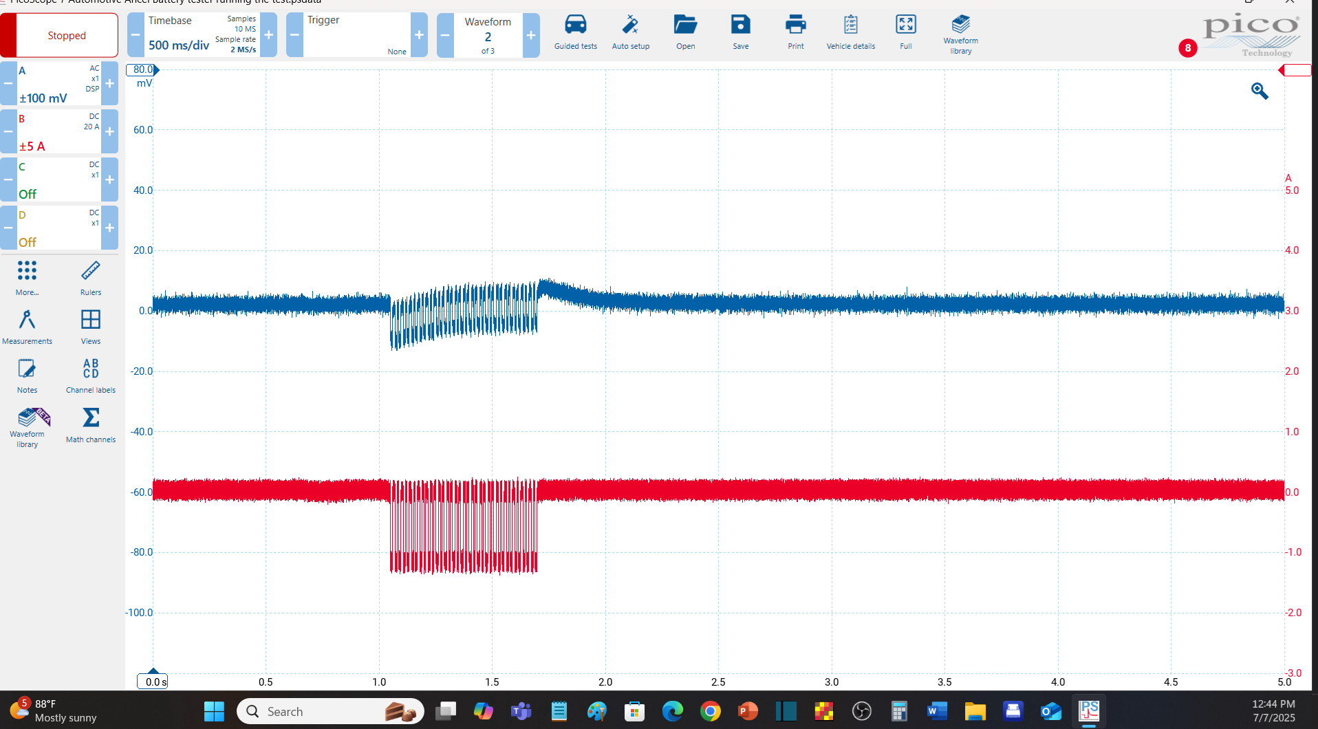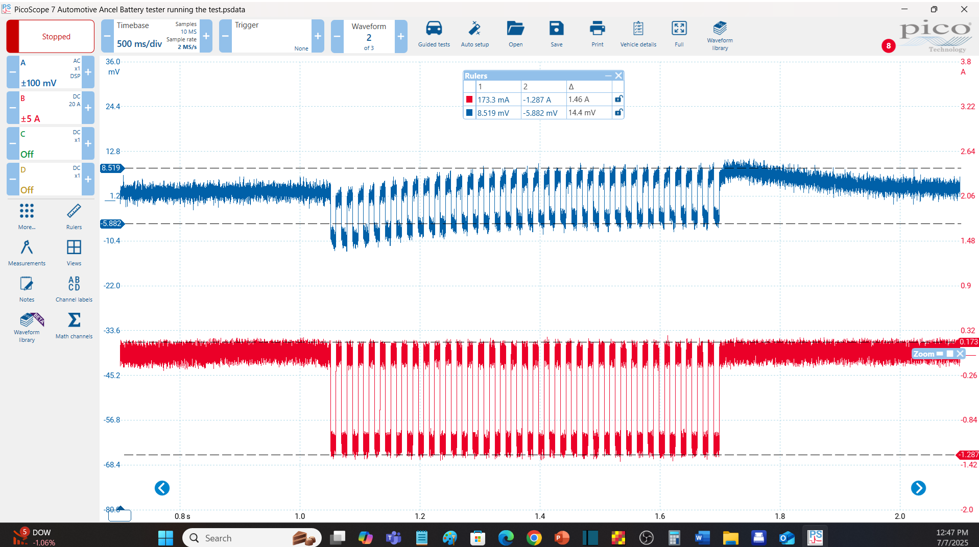 The blue trace is the battery voltage, AC coupled to help display the amplitude of the change and the red trace is the current that is being drawn from the battery. Ohms law states that if you know the voltage, and the current you can calculate the resistance. This is pretty easy to do with basic DC circuits but takes calculus to deal with a conductance test like this. I'll just say the battery being tested passes, but needs charged.