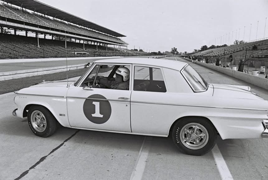 Andy Granatelli behind the wheel, supercharged ‘63 Lark Regal two-door sedan, at Indy in ‘63. 289 hp in a compact, and with disc brakes it could not only go, but stop.