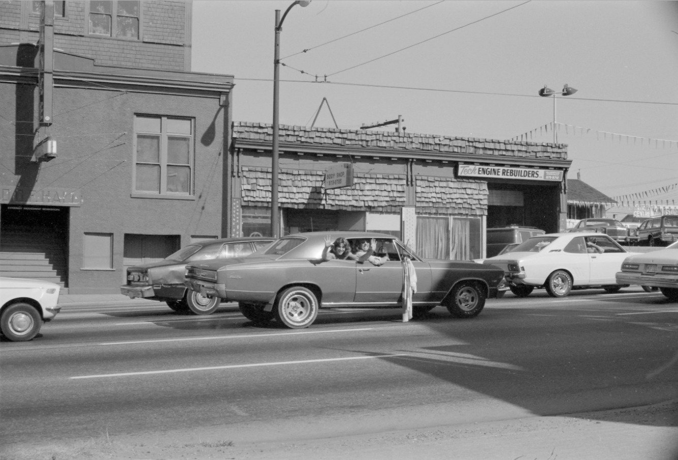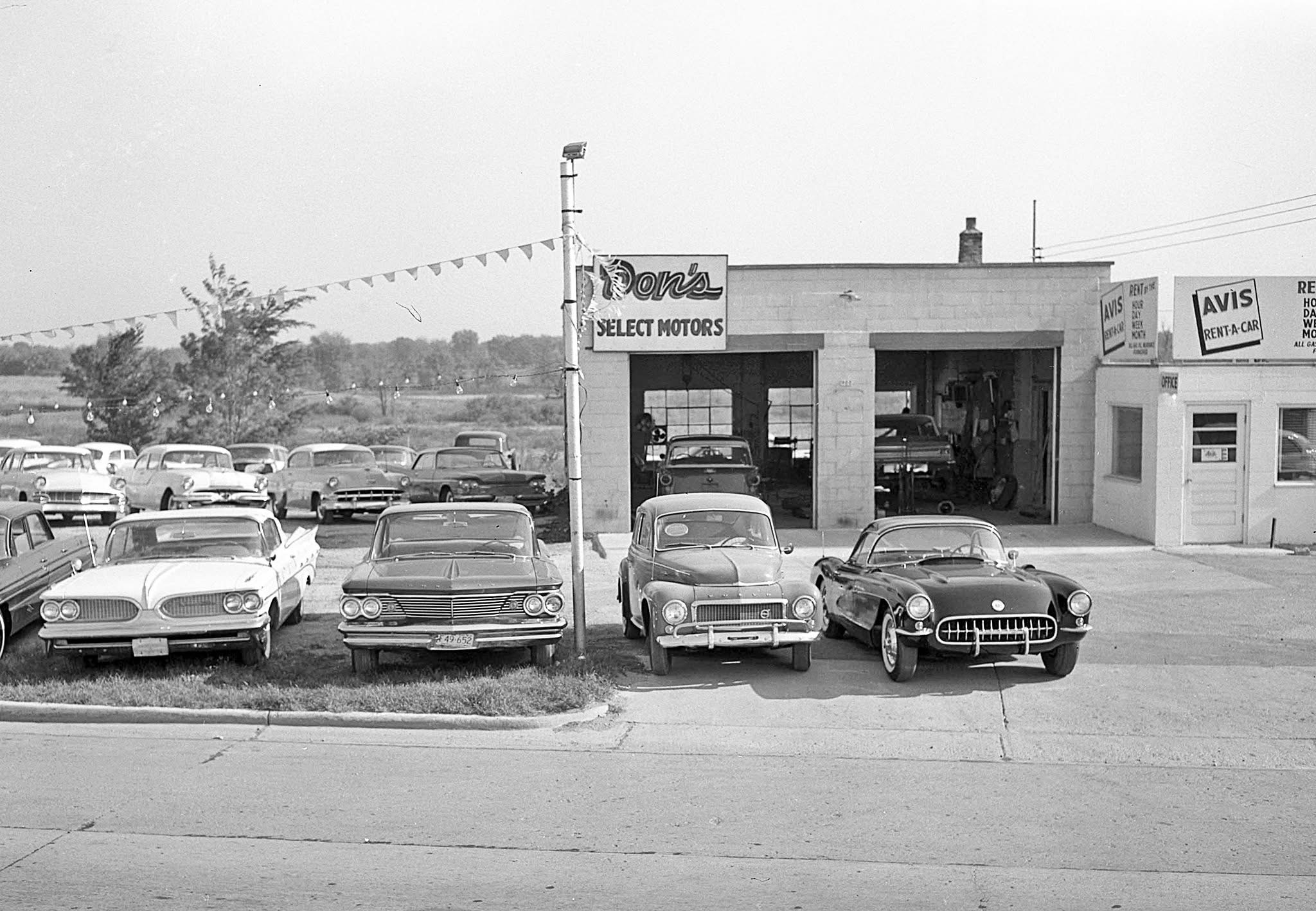 Ordinary old used car lot in Seattle in the 70s, should be able to zoom in enough to ID a few: