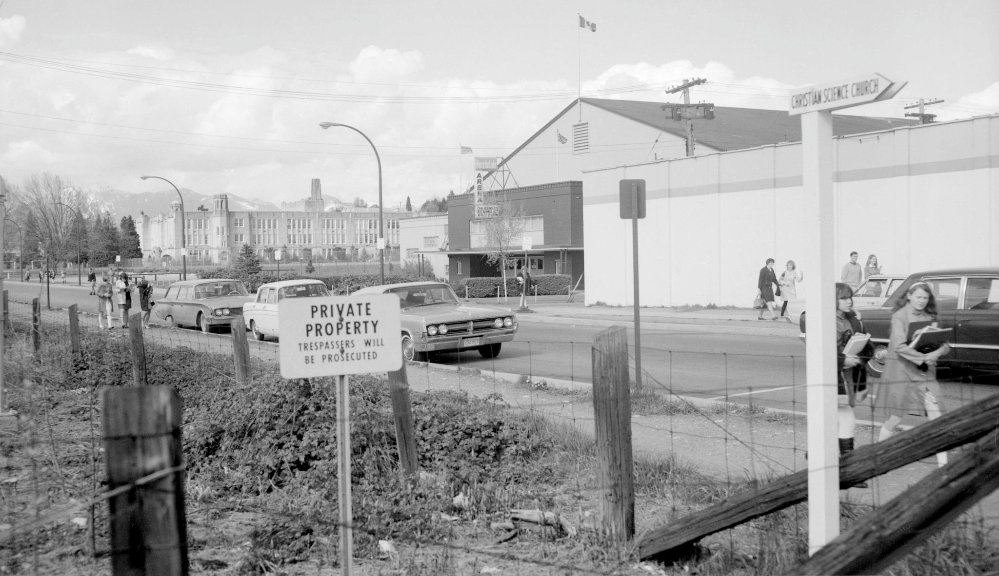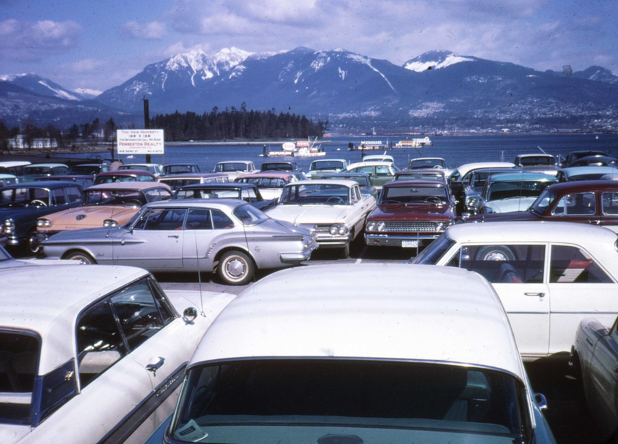 Vancouver, by the file name appears to be February 1964. A tightly packed parking lot with a lot to see, zooms nicely: